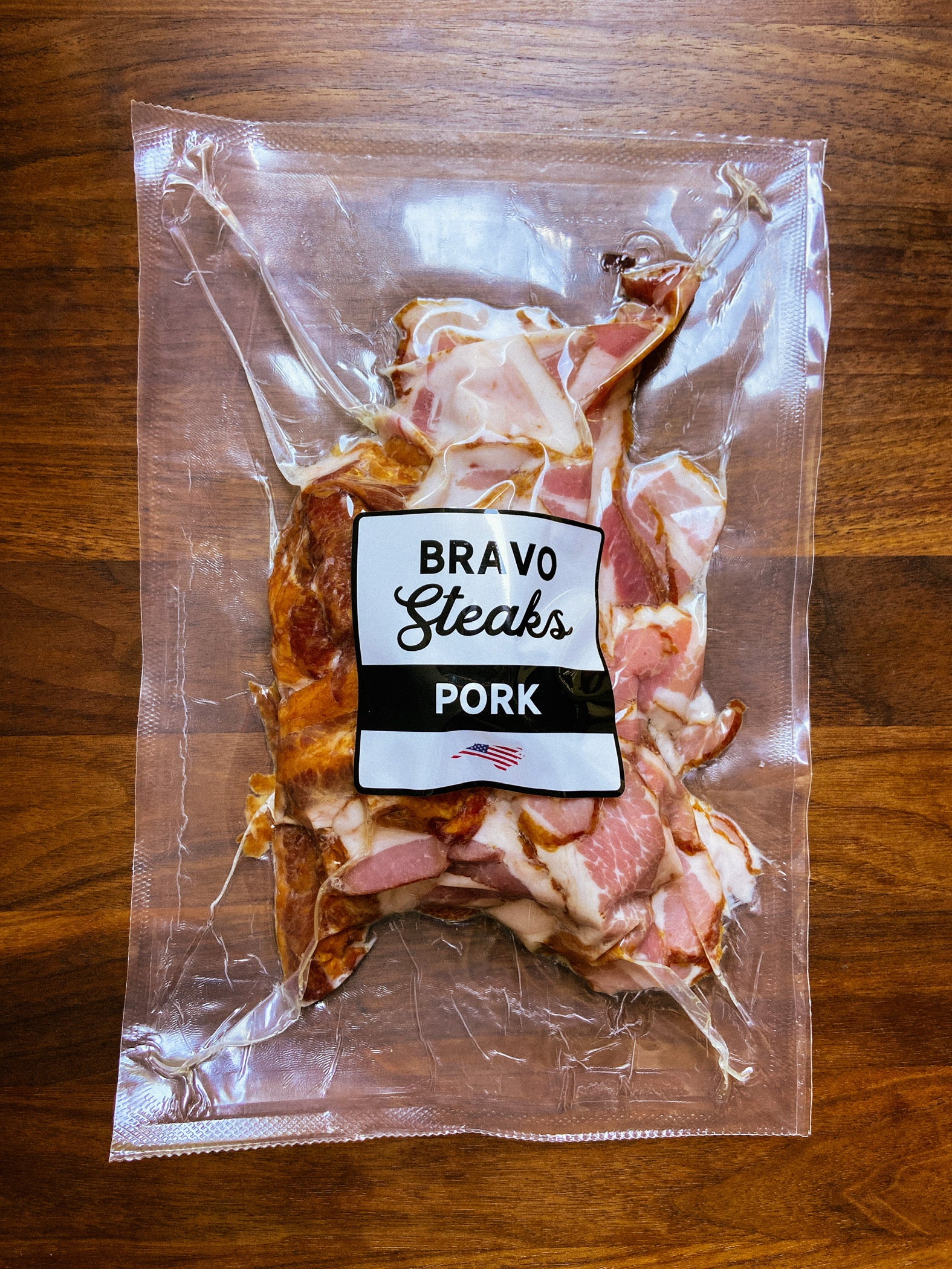 1 to 1.5 pound package of hickory smoked bacon ends from our Berkshire pigs.