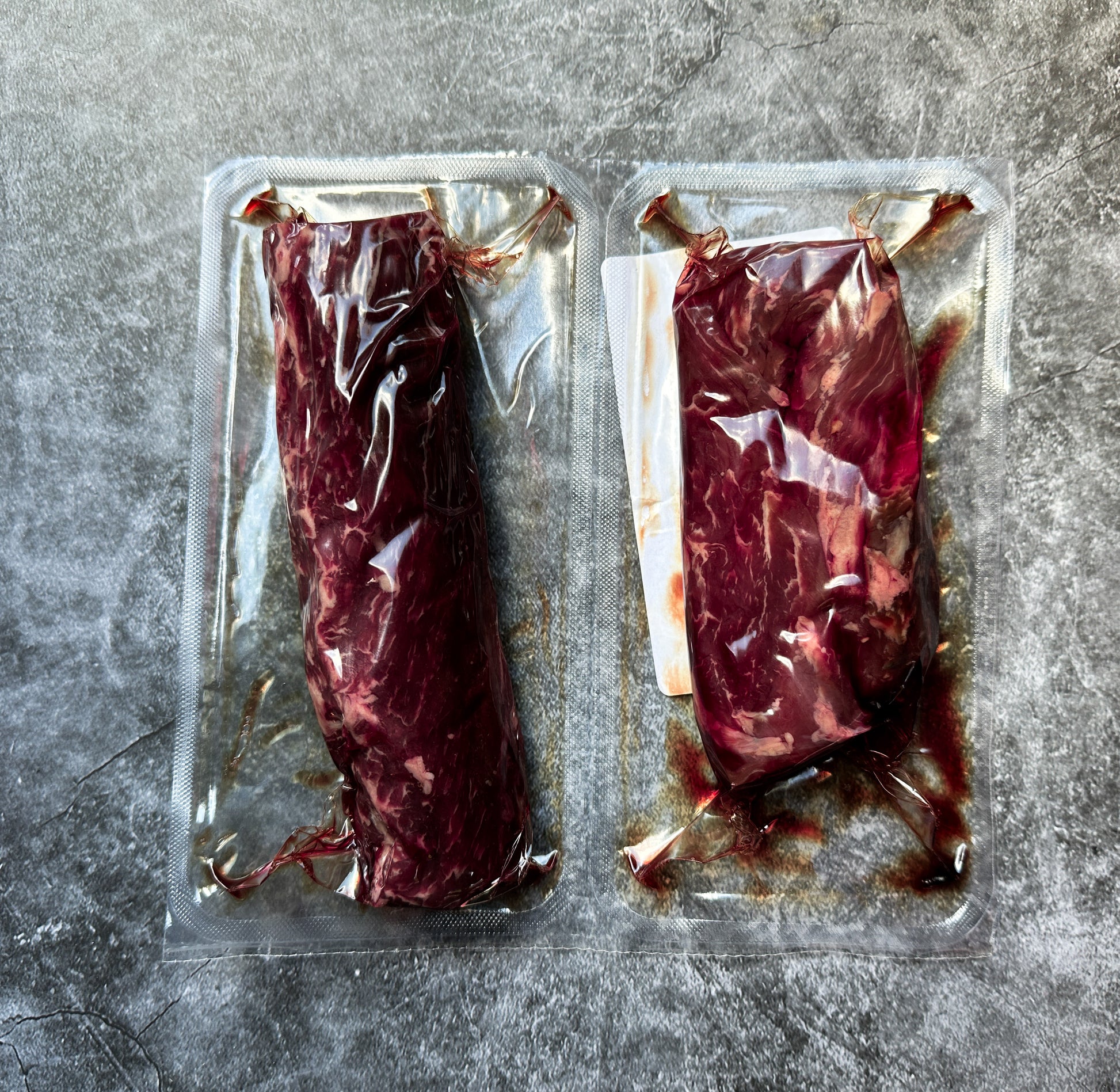 Also sometimes called the "butcher's cut," the hangar steak is a best kept secret of tender tasty cuts. Hangar steaks have a dark, rich color, large and marbled striated fibers, deep flavor, and they're very tender.