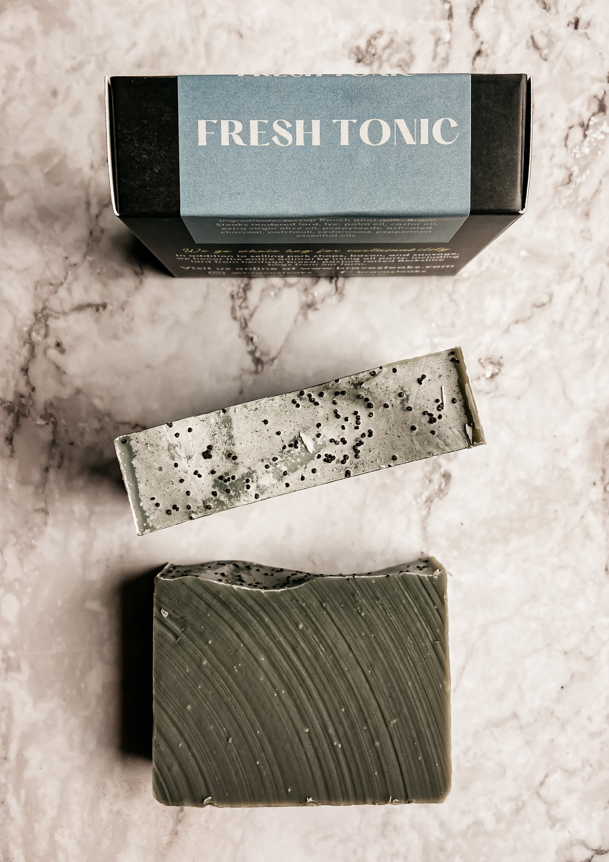 Fresh Tonic - Bright, fresh, and earthy! This soap bar contains patchouli, cedarwood, and peppermint tones.