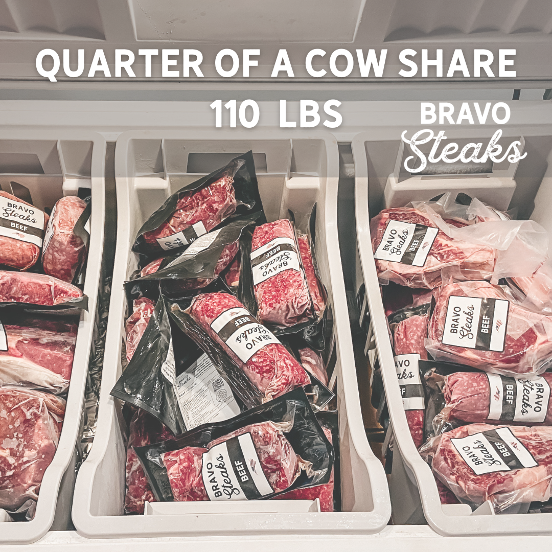 tock your freezer with 1/4 of a cow share. Here's a list of beef included in a 1/4 cow share. All beef has been dry aged for 21 days for exceptional flavor and tenderness. All beef is vacuum sealed and delivered to you frozen.